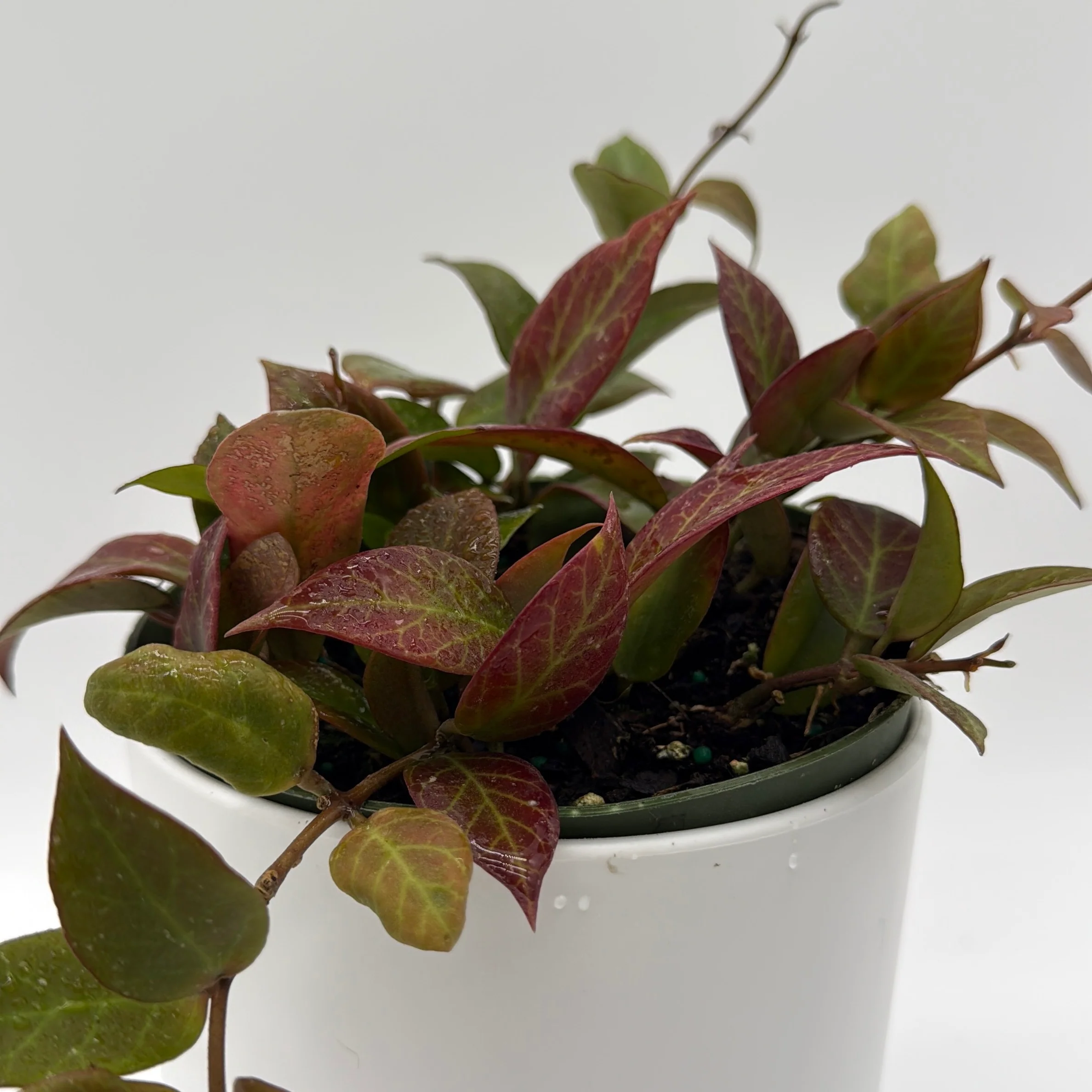 The Hoya Sunrise is a beautiful hybrid variety, created by crossing Hoya lacunosa and Hoya obscura. Known for its slender, oval-shaped leaves, this plant transforms under bright light, developing rich red and maroon tones that contrast beautifully with its green base. In addition to its striking foliage, the Hoya Sunrise produces clusters of small, fragrant, creamy-white flowers, making it both a visual and aromatic delight.