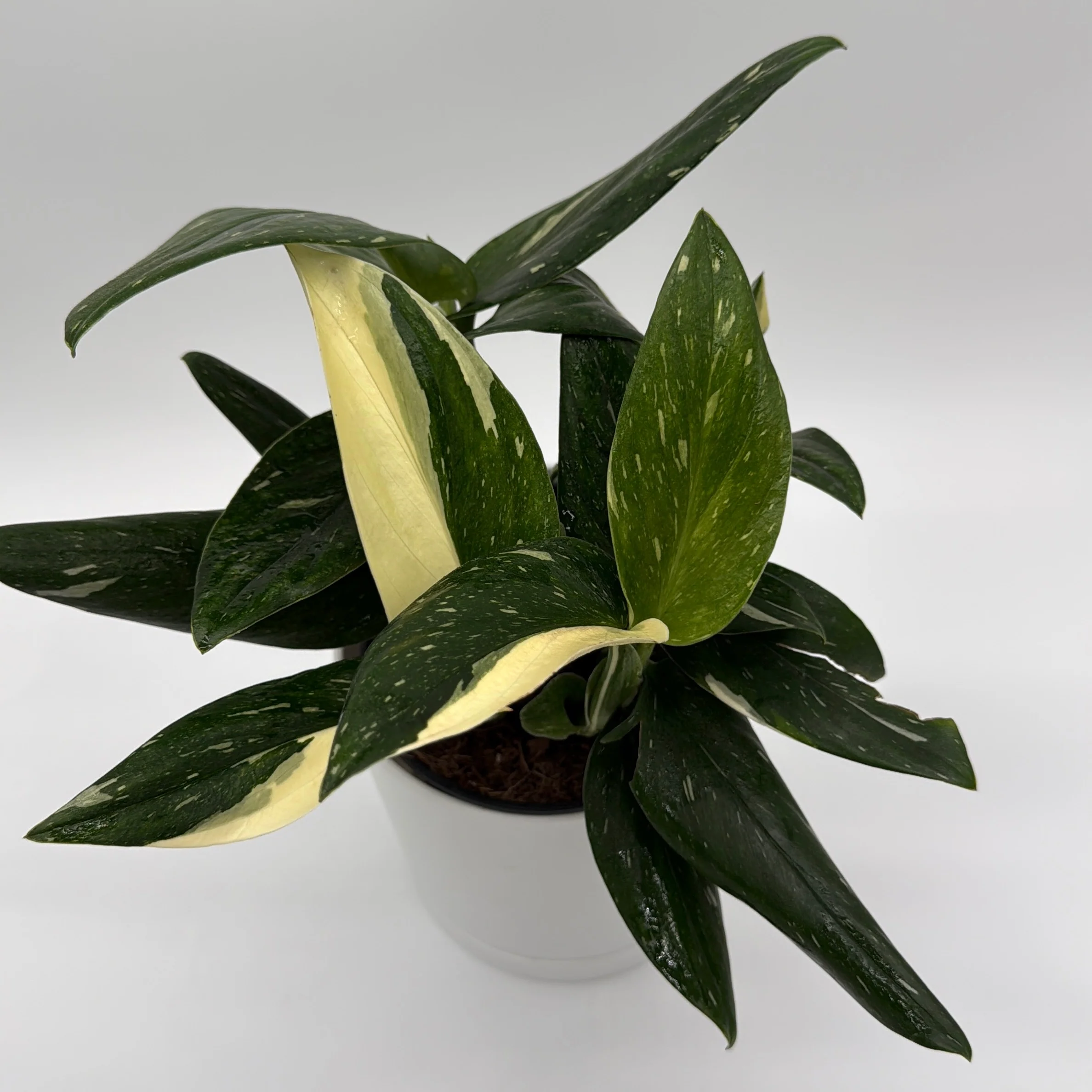 Rare, striking, and full of movement — the Variegated Monstera ‘Cobra Albo’ is a captivating climber prized for its marbled variegation and unique, flowing leaf shape. Each leaf features a dynamic mix of creamy white, soft green, and deeper emerald tones, often forming bold streaks and splashes that resemble the pattern of a cobra’s skin. No two leaves are ever alike, making every plant a true one-of-a-kind.